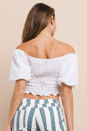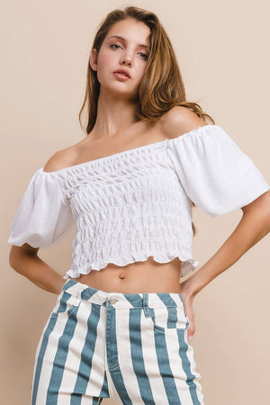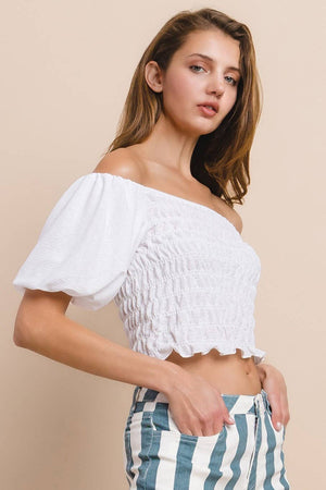 TEXTURED KNIT SMOCKED TOP WITH DOUBLE LAYERED POOF SLEEVES MADE IN USA #BOHO, RESORT, VACAY, FESTIVAL, BEACH TOP,