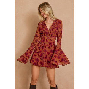 Floral print mini dress with ruffled detail. Model is 5'9" and wearing size Small,