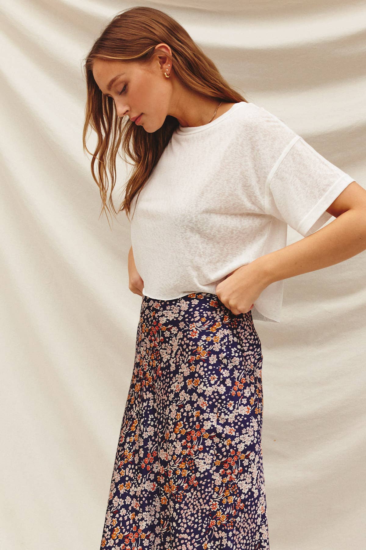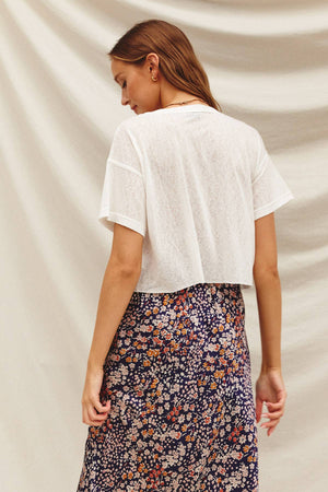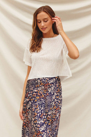 The Kai tee is your perfect short sleeve t-shirt is made with a thin breezy fabric cropped length with raw edged hem. Everyone needs their favorite white tee for the ultimate staple in your wardrobe.