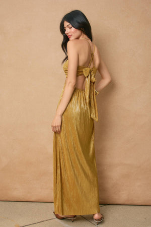 Metallic midi dress with a chevron waist cutout and adjustable ruched bra top. Tie closure on the back waist. The adjustable shoulder straps can be cross or uncrossed at the front. Fully lined. Model is 5'8" and wearing size Small. Shell: 44% Nylon, 42% Polyester, Metal 9%, 5% Spandex Lining: 100% Polyester