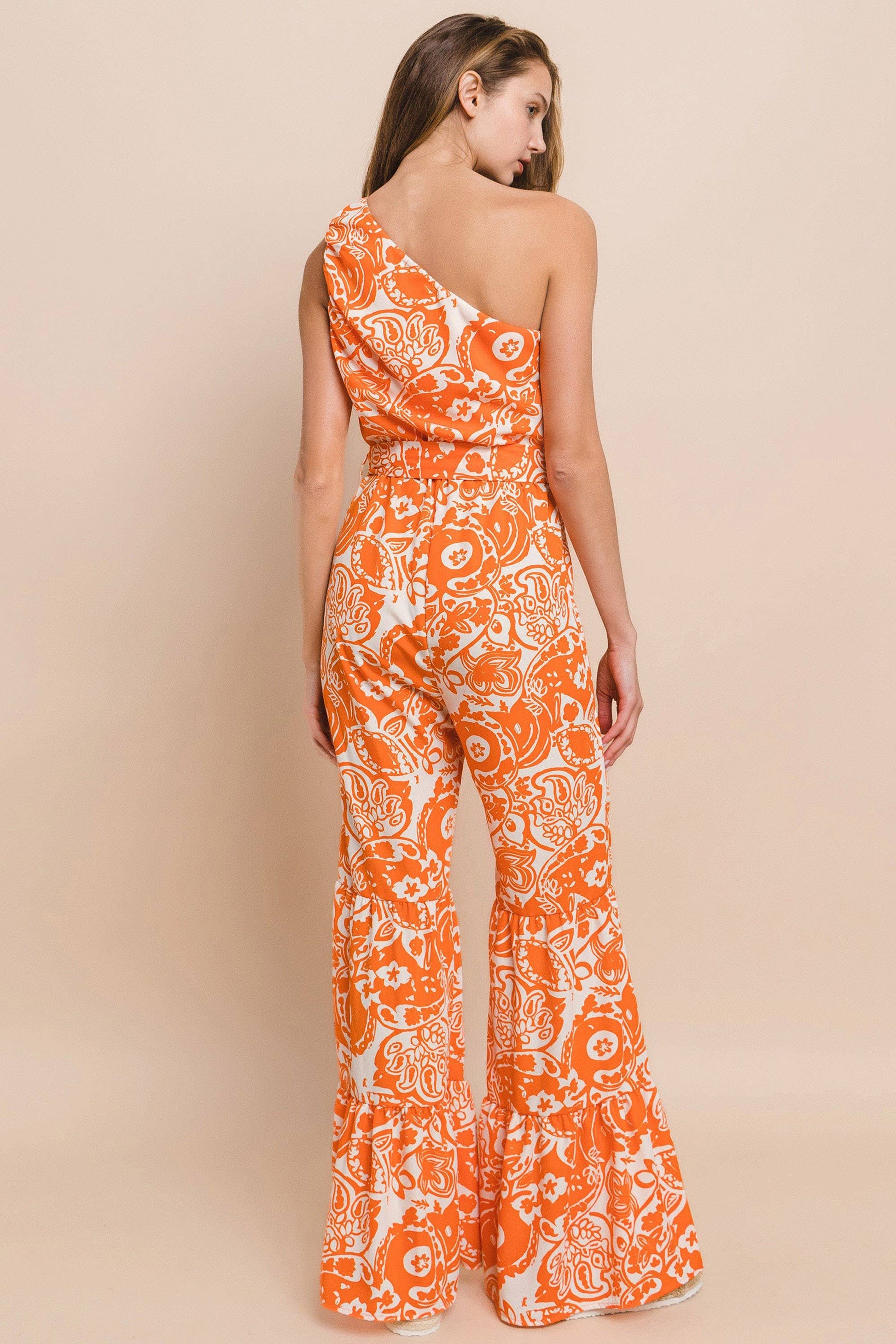TIERED LEG DETAILED ONE SHOULDER PRINTED JUMPSUIT WITH WAIST SASH MADE IN USA 32" INSEAM