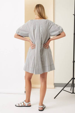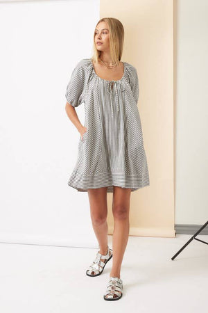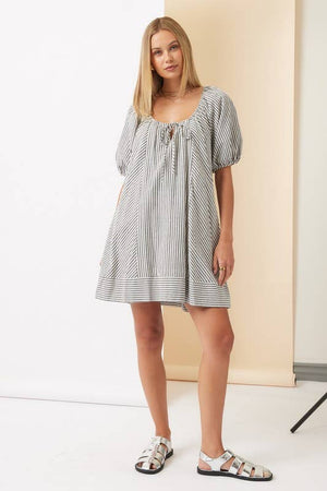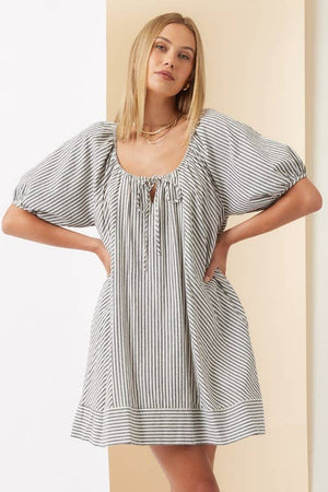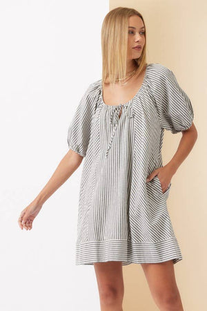 Striped mini dress with puff short sleeves and buttoned cuffs, side pockets, tunnel strap front tie, and lining.